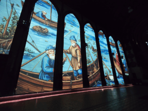 Nadat we samen de lekkere vislasagne hadden gegeten, begaven we ons naar de Dominicanenkerk voor het lichtspektakel over de visserij.